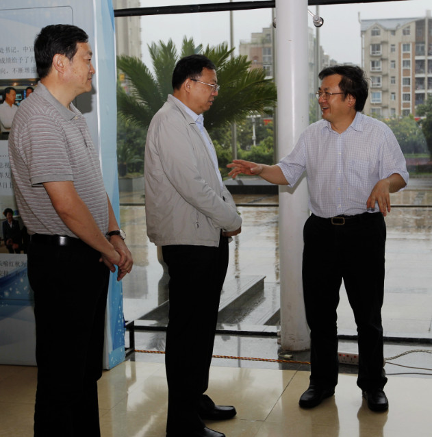图为:赵景春(中)听取刘文岚(右)和李巍(左)汇报工作