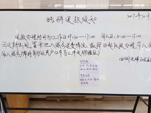 这位名为“大白兔”的微信用户的家人也很用心,提供了一张2017年10月份的“酷骑退款的须知”照片。