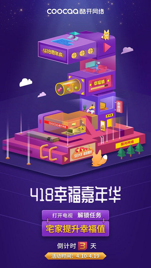 2020年的春天和往年有所不同,赏花、逛街、购物、蹦迪的娱乐生活被宅家战“疫”模式取代。但是宅家太久也觉得枯燥无趣?好消息来了,2020年酷开网络418周年狂欢趴升级客厅新玩法,让你“宅”出幸福感!据融合网&呼麦网小编获悉,2020年4.10-19日活动期间,酷开网络推出“创建幸福家园”主题活动,活动参与零门槛,打开电视首次进入活动即可获得幸福值和等级奖品,同时还有抽奖秒杀等会员日专属福利。这个418,如何提升幸福感?赶紧收好这份“通关”攻略吧!