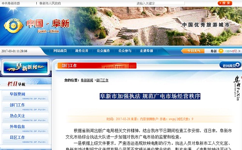 2017年2月28日,辽宁省阜新市人民政府官网“阜新新闻>部门工作”对外发布一则标题为《阜新市加强执法 规范广电市场经营秩序》的消息,以下为全文内容——