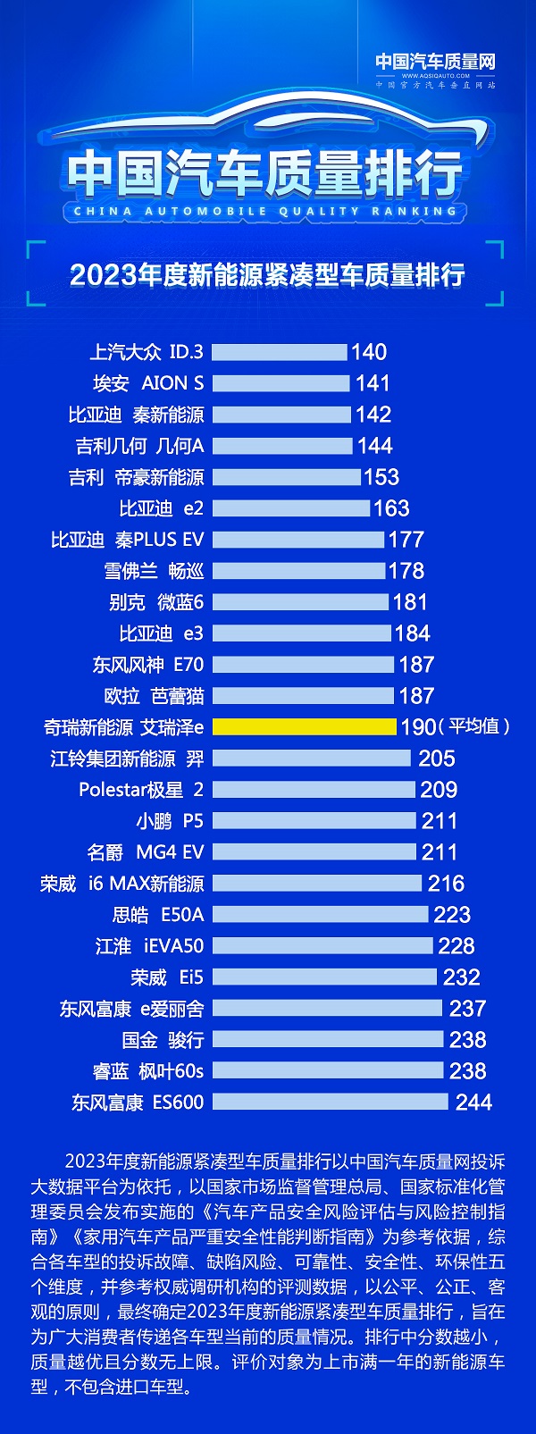 以中国汽车质量网投诉大数据平台为依托,中国汽车质量排行综合各车型的投诉故障、缺陷风险、可靠性、安全性、环保性五大维度,并参考权威调研机构的评测数据,对上市满一年的新能源车型进行综合评测并确定排名情况。