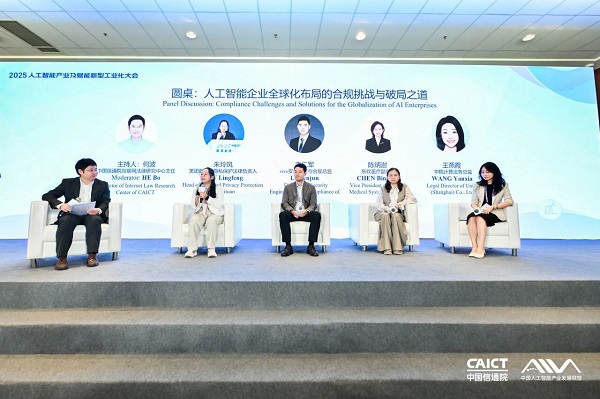随后会议进行了主题为“人工智能企业全球化布局的合规挑战与破局之道”的圆桌分享。由中国信息通信研究院互联网法律研究中心主任何波主持,东软医疗系统股份有限公司副总裁陈炳澍、vivo安全工程与合规总监李仁军、美团数据和隐私保护法律负责人朱玲凤、华院计算法务总监王燕霞等人参与。
