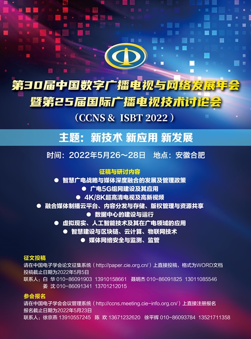 2020年爆发的新冠疫情仍在各地一波一波地反复肆虐,给人们的工作、学习、生活等造成了诸多不便。在疫情防控的新形势下,为了共享资源、共克时艰,中国电子学会的两个分会——有线电视综合信息技术分会和广播电视技术分会首度牵手,拟于2022年5月26~28日在安徽合肥共同举办“第30届中国数字广播电视与网络发展年会暨第25届国际广播电视技术讨论会(CCNS&ISBT2022 )”,会议的论文征集工作(咨询热线010-86091341)将于2022年5月5日截止,参会报名(咨询热线010-86093784)的早鸟票将于2022年4月30日停发。