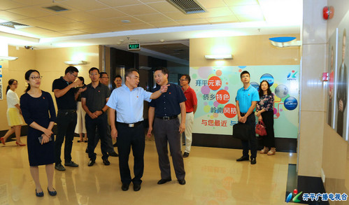 邝积康一行看望慰问了开平广播电视台新闻工作者,观看了“中央厨房”工作流程介绍片,详细了解开平市融媒体平台的功能、运作等方面情况。