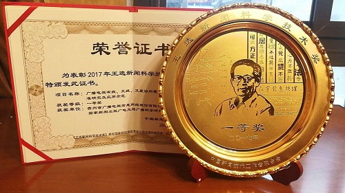 2017年11月23日,中国新闻技术工作者联合会发布“2017年度王选新闻科学技术奖”获奖结果,由贵州省广播电视信息网络股份有限公司(以下简称“贵广网络”)申报的“广播电视有线、无线、卫星协同覆盖智能承载网技术体制标准研究及应用示范”项目荣膺“2017年度王选新闻科学技术奖”一等奖,这是近年来贵州广电系统获得的最高技术类奖项。